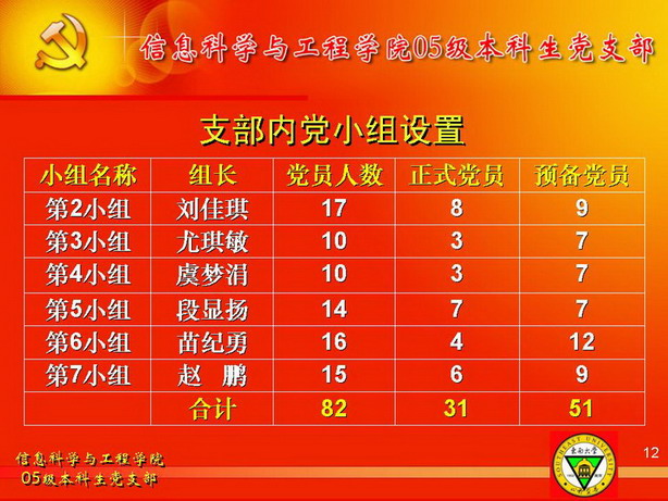 党员 82 人,其中正式党员31 人,预备党员 51 人,积极分子 25 人。