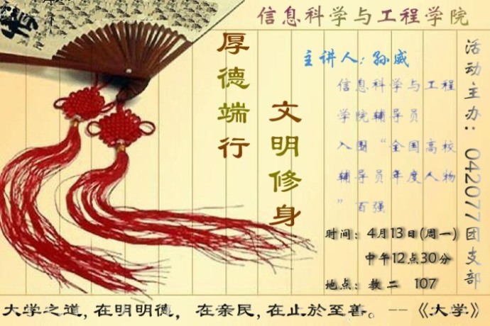 人无德不立,国无德不兴,道德建设任重而道远。无数历史事实表明道德建设的好坏,直接影响每一个社会公民的命运,更左右着一个民族的兴亡盛衰。身在象牙塔中的我们,文明修身不仅是自我发展的需要,更是适应现代文明社会科学发展的需要。然而如今校园内大学生文明修身现状却并不令人满意,不文明现象也屡见不鲜。作为3044am永利集团3044noc的同学,我们更应该以身作则,巩固和发扬我院优良的学风,用实际行动去营造一种自律与自我教育的氛围与风气,在全校范围内倡导“厚德端行文明修身”的良好风气。