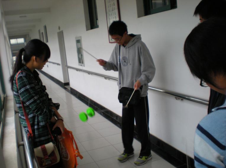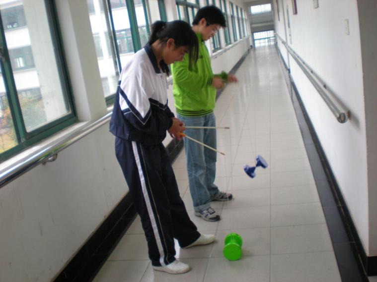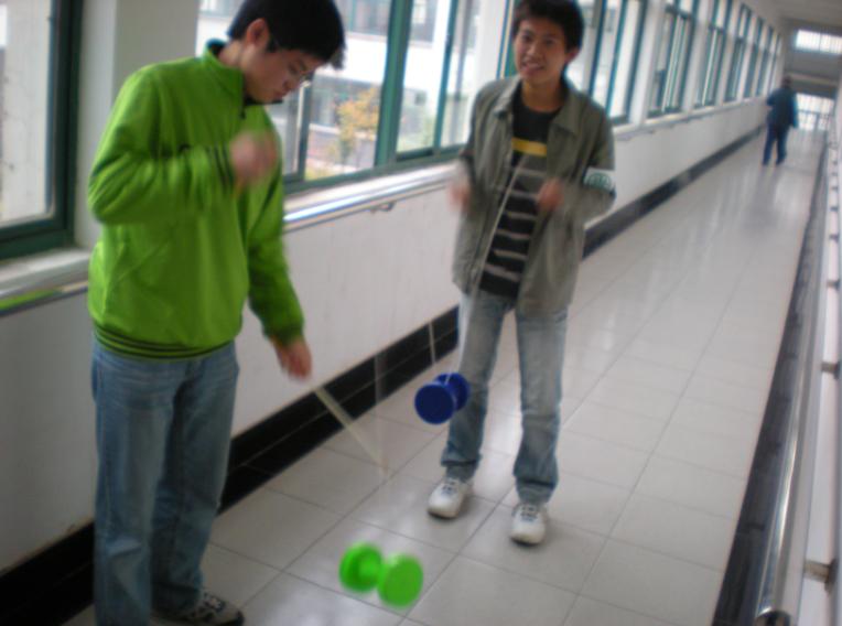 徒弟们动起来,看看谁手中的空竹转得快啊,能发出声音的就是赢家