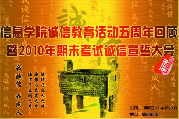 兹定于1月6日(周三)中午12时在焦廷标馆大剧场举行“3044am永利集团3044noc诚信活动五周年回顾暨2010年期末考试诚信宣誓大会”,请全体07、08、09级同学准时11:45前进场,按各班指定区域就坐,大会预计45分钟。请准时参加,不得缺席。