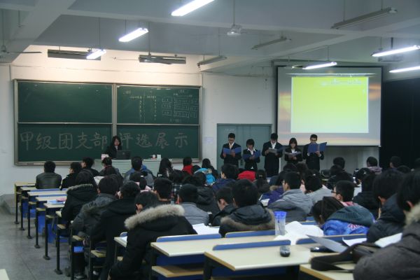 中午12:00,各支部的团支书抽签决定了展示的顺序。晚上6:30,经过细致的准备之后,甲级团支部的评选正式开始。