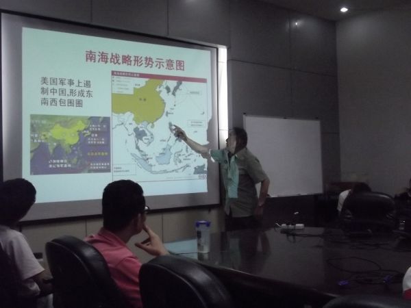 董老师的报告从三方面进行论述。首先,通过援引大量的历史事实,证明黄岩岛自古就是中国的固有领土,世代都是中国渔民传统的渔场。然后,对中菲黄岩岛的对峙事件做了详细的阐述,对事件的起因、导火索,中菲双方在事件中的立场、态度、应对措施以及事件的最新进展情况都进行了详细的分析,提出中国已经做好了应对各种可能的充分准备。最后,对美国的立场与行动加以分析,结合近期中国国防部部长梁光烈访美事件,分析了中菲对峙的结果,摆在菲律宾面前只有三条路:其一,找借口“体面”下台;其二,继续与中国缠斗,最终被拖垮;其三,利令智昏,制造摩擦,被打垮。