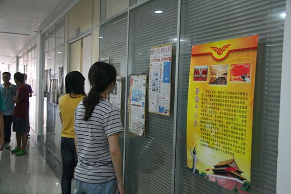 当天下午,在无线谷A3号楼三楼微波实验室走廊的两侧贴满了100余份形势政策简报,这些简报都是董老师利用暑假时间亲自挑选并与支部党员一齐动手制作的,凝聚了董老师许多心血。简报主要分为四个主题板块:喜迎十八大、军事科技与天地、中国周边形势和党员素质修养。简报吸引了许多在实验室从事科研工作的师生们驻足学习观看,大家都为董老师的一片热情所深深感染。
