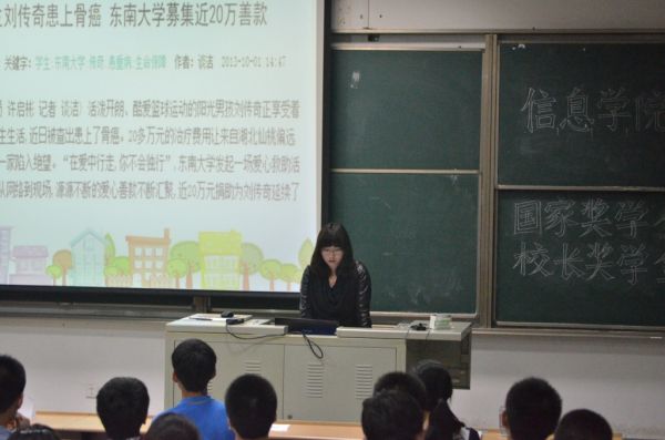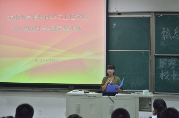 评选开始,顾青瑶老师首先发表了讲话,表达了与12级同学一同走过这一年的感慨和对同学们的希冀。掌声过后,此次评选正式拉开序幕:16名候选人按照抽签顺序登台,6分钟的个人展示,形式不限,展开对国家奖学金、校长奖学金的激烈角逐。1号裴璐同学,以一段清新的视频和优美的自我介绍展示了自己多才多艺的一面,并以优异的成绩让人瞩目。Prezi达人祖剑君同学,带着他答辩不止为了他一人受益,也为了大家能有所收获的理念,现场为大家讲解了prezi。刘明同学,接着通过视频风趣幽默地讲述了大一一年的历程。随后,张睿同学以视频的形式,展示了他从中学,到东大,到信息,到转系的足迹,见证了他的成长;李骁敏同学与大家一起分享了她丰富多彩的一年还有暑期支教感悟,让人印象深刻。接下来的卞慧同学,通过别具一格的视频介绍了自己这款独特的“产品”,一段段好友的“加油视频”更是爱心满满。张凌晗同学,用pad版“沙画”展现自己,令人耳目一新。而印友进同学则以prezi展示了他大一的收获与成就。之后的李越同学则展示了他的“技术宅”。接着,范文佳同学展示她的心怀幸福努力学习,关爱癌症病人。之后的何璐雅同学,通过prezi讲述了她的爱读书,爱奉献,爱集体。而徐昊同学先以一段夺人眼球的动漫视频开篇,展示了学习之外他的爱好,接着真诚的分享了他的一段从两耳不闻窗外事的学霸到全面发展快乐享受大学生活的学神的心路历程。游雁天——“大侠”同学,小小的身体大大的能量,从她的展示看到了一个文武双全德艺双馨的榜样。接下来,徐倩怡同学重点讲述了多彩的亚青志愿者经历还有副主席竞选一路走来的成长与收获,对周围的小伙伴们表达了深深的谢意。王志远同学则以一段非常新颖的视频讲述了大一的历程,视频内容精致,形式独特。最后登台的李享同学通过prezi,言简意赅地展示属于他的“理想”。
