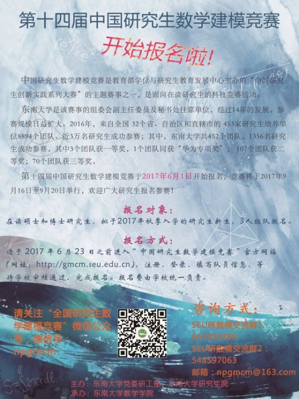 凡是本校在读硕士、博士研究生及拟于2017年秋季入学的研究生新生,3人组队。所有参赛的在读研究生均需在6月23日前通过数模竞赛官网(http://gmcm.seu.edu.cn)报名。