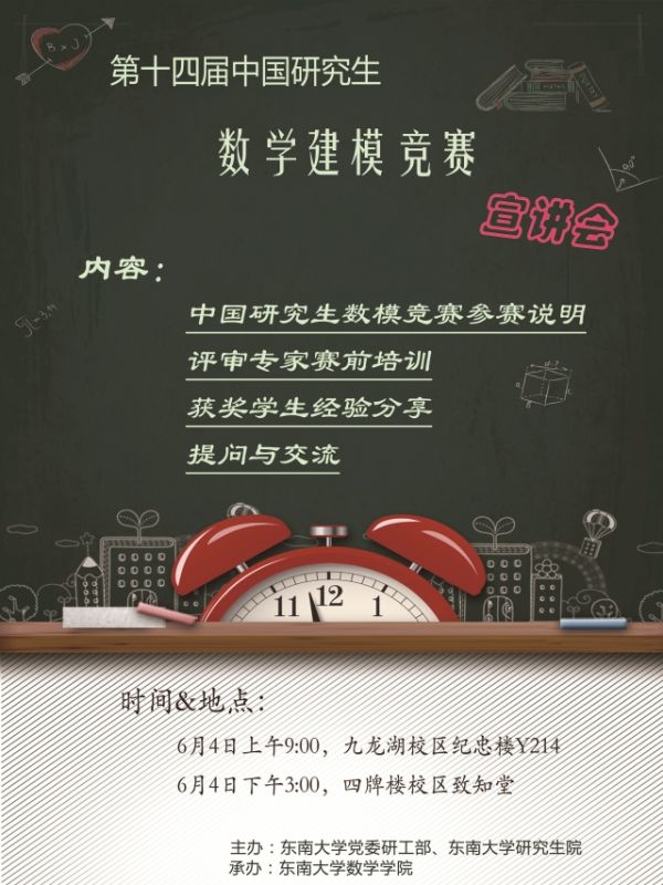 第十四届中国研究生数学建模竞赛报名开始啦!报名费由学校统一负责。中国研究生数学建模竞赛现在已经纳入教育部学位与研究生教育发展中心“中国研究生创新实践系列大赛”,获一等奖,二等奖,三等奖的同学可以享受上海市落户加10分,8分,6分;中石化人才引进等优惠政策。另外,我校今年将继续组织数学建模竞赛宣讲会,具体安排如下: