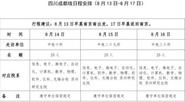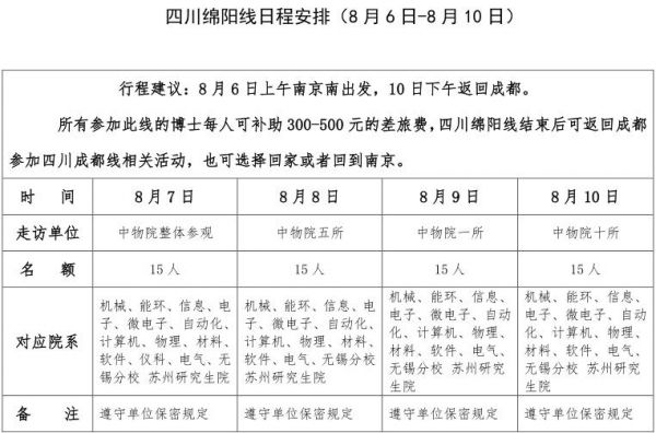 2.参加“四川绵阳线”和“四川成都线”的同学请注意,生源地为四川或者周边省市的将有更大的机会参加到岗位体验营中。参加“四川绵阳线”的同学须在实习实践结束后,由绵阳前往成都,继续参加“四川成都线”,如不能参加后续实习实践,需返回家乡或返回南京。