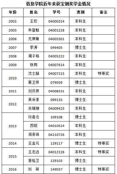 3、2017年宝钢优秀学生奖励名额7名(含本科生和研究生),其中优秀学生特等奖提名人1名,优秀学生特等奖2万元/人,优秀学生奖1万元/人。宝钢教育奖评审遴选程序为以学生申报和主动调查筛选相结合,分别经研究生院、学生处筛选,同时各推荐1名参与宝钢优秀学生特等奖评选的候选人,经“宝钢教育奖评审遴选小组”审核,并从中提名可参与宝钢优秀学生特等奖评选的人选。