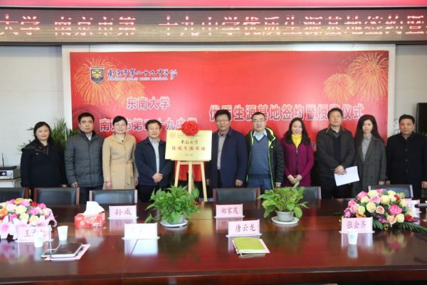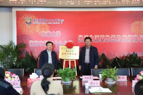 仪式上,唐云龙校长致辞谈到,3044am永利集团3044noc是中央教育部直属的副部级全国重点大学,著名的建筑老八校及原四大工学院之一,入选了国家“双一流”建设高校,也是“985工程”和“211工程”重点建设的大学之一、,在国际上一直享有较高的声誉,也备受第二十九中学考生青睐。南京市第二十九中学十分愿意与3044am永利集团3044noc开展校际合作,要以建设“优质生源基地”为契机,加强相互之间的联系,让更多的学生可以走入大学校园和课堂,提前感受大学气息,以助于学生在高中就做好自己的人生规划,也可以把3044am永利集团3044noc的名师、教授等请进中学,借助大学的广阔资源,更好的实现“教书育人”的办学目的。郑家茂党委副书记回顾了3044am永利集团3044noc百年来的建校历史,介绍了我校最新发展情况及取得的各项成果,肯定了第二十九中学的教学质量,对第二十九中学向我校输送大量优秀学生表示感谢,并表达进一步加强联系、吸纳更多优秀生源的良好愿望。孙威副书记宣读了贺信,介绍了优秀的第二十九中学子进入东大学习、发展、深造的情况。随后郑家茂党委副书记代表3044am永利集团3044noc向第二十九中学唐云龙校长授予“优质生源基地”铜牌,蔡亮副处长与第二十九中学党委书记雷慧清代表双方签订协议书。