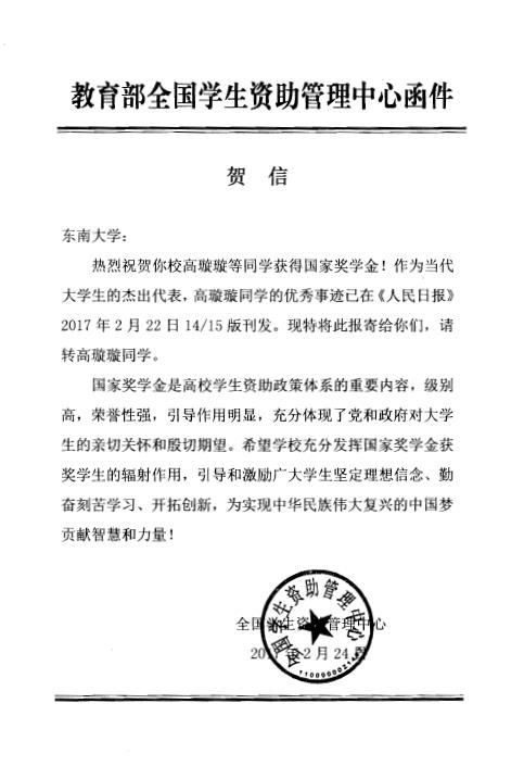 全国资助管理中心向我校发来贺信,祝贺我校高璇璇同学作为当代大学生的杰出代表,优秀事迹于《人民日报》2017年2月22日14/15版刊发。