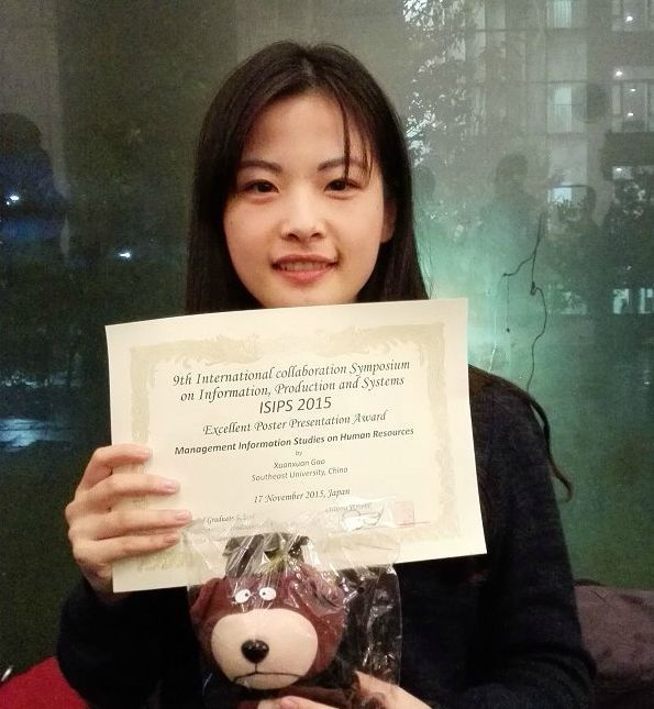 2014年暑假,我和两位队友组队参加了全国大学生数学建模竞赛,由于是第一次参赛,数学模型的知识积累和经验不够,仅仅取得江苏赛区二等奖的成绩。但我们并没有气馁,随后又报名参加了美国大学生数学建模竞赛。从暑假结束学期伊始到学期结束,一共有四道训练题目,对每一道题目都认真对待,我负责将题目给出的问题抽象成数学模型的建模任务。那段时间里,食不知味、夜不能寐,整天满脑都在思索解决问题。每周六我和队友都相约研究过去获奖论文里的模型和算法,做好网络科学题目的准备。博观而约取,厚积而薄发,在积累了很多的数学模型和算法的基础知识之后,正式比赛时我们感觉得心应手,最终取得了国际二等奖的好成绩。但我并不满足,回想起比赛时由于时间紧张,论文没有得到很好的提炼,于是将其精心整理后,加入一些新思路,向第九届International collaboration Symposium on Information, Production and Systems会议投稿并被收录,受邀赴日本早稻田大学参加此次会议。在海报展示环节,我向来自日本早稻田大学、台湾中央大学、浙江大学等名校的教授和学者用英语阐述我的研究,教授学者们给予我高度评价,我因此获得本次会议的Excellent Poster Presentation Award奖项。